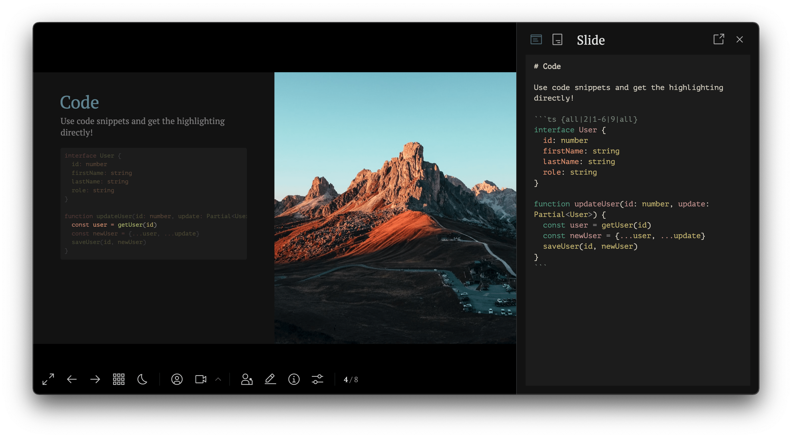 Slidev comes with an integrated editor that will instantly reload and save the changes to your file.